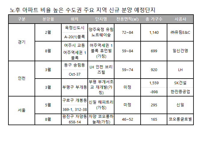 경기권에선 동두천(준공 15년 이상 노후 아파트 비율 70%)과 의정부(65%), 포천(60%) 인접 지역인 양주 옥정신도시에서 올해 새 아파트가 공급된다. 유림E&C가 내달 옥정신도시 1140가구 규모의 '양주옥정 유림노르웨이숲'을 분양할 예정이다.