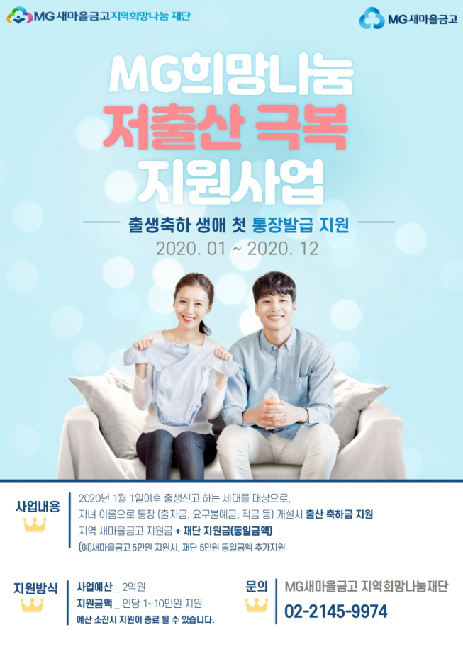 MG새마을금고 지역희망나눔재단은 저출산 문제 해결을 위한 ‘MG희망나눔 저출산 극복 지원사업’을 실시한다고 20일 밝혔다.