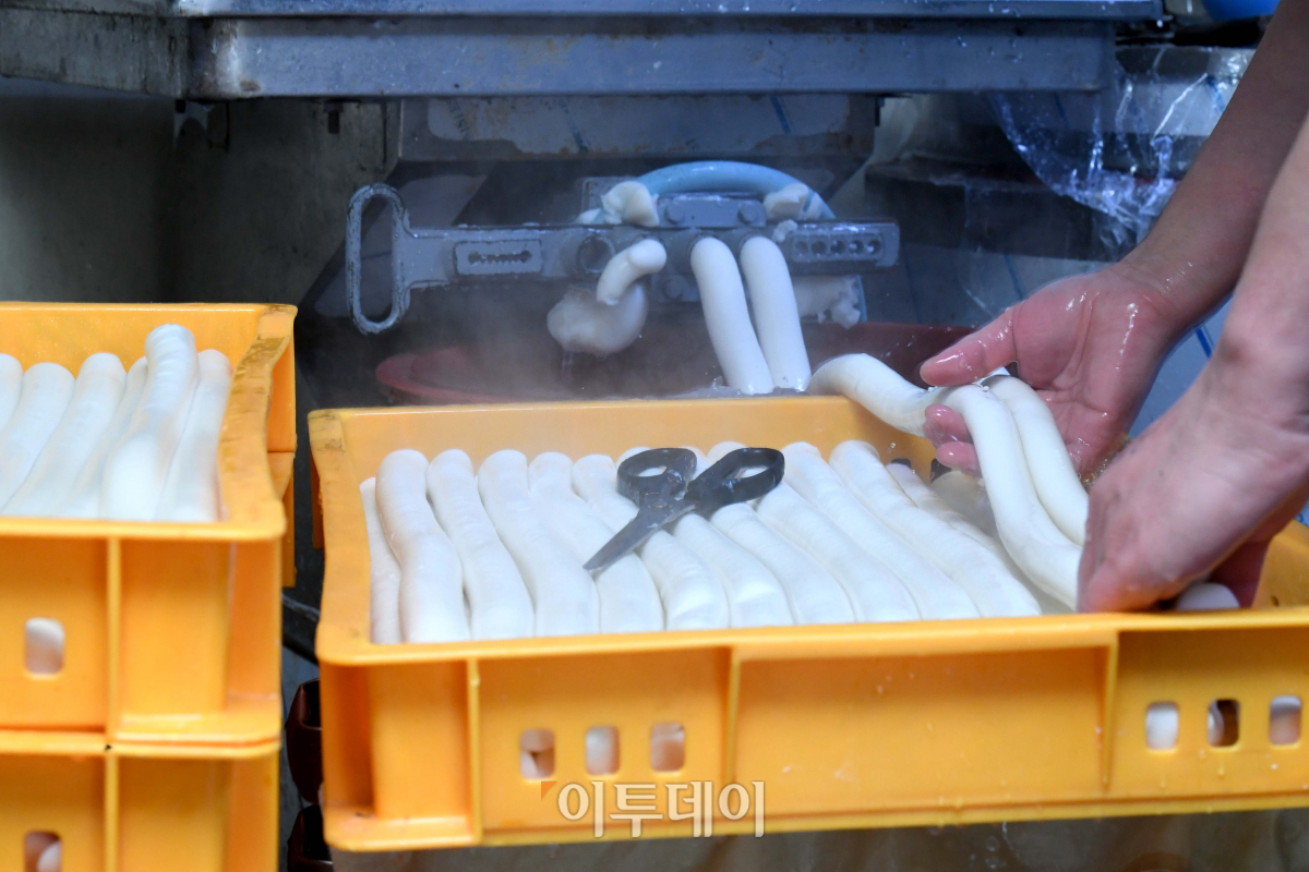 설 연휴를 사흘 앞둔 21일 경기 평택시의 한 떡집에서 상인이 분주하게 가래떡을 뽑고 있다.