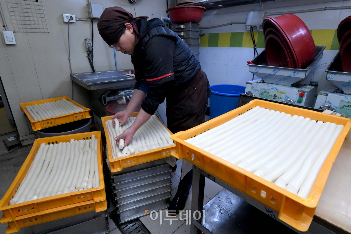 설 연휴를 사흘 앞둔 21일 경기 평택시의 한 떡집에서 상인이 분주하게 가래떡을 뽑고 있다.