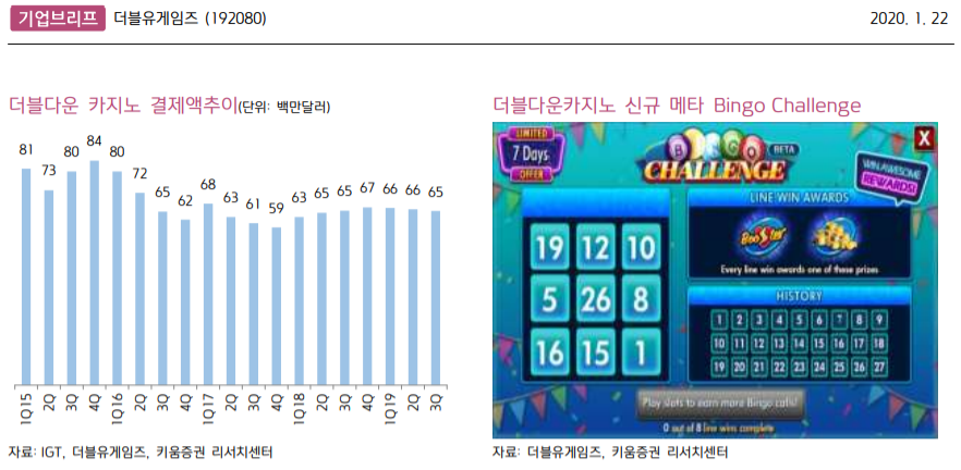 키움증권은 더블유게임즈에 대해 22일 전반전으로 산업 성장세가 둔화하는 상황에서 주력게임인 더블다운카지노(DDC)의 성과에 집중해야 한다며 투자의견 ‘매수’, 목표주가 8만원으로 하향 조정했다.