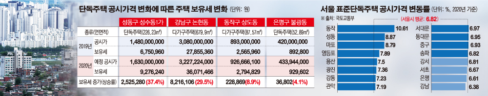 #1.대기업 임원 출신인 A씨는 2년 전 서울 동작구 상도동에 있는 다가구주택(단독주택) 한 채를 마련했다. 지난해 A씨 집의 공시가격은 8억9300만 원이었다. 1주택자인 A씨는 지난해 보유세로 256만 원가량을 냈다. 올해 그의 주택 보유세 부담은 그보다 22만 원가량 늘어날 예정이다. 여기엔 그동안 안 내던 종합부동산세도 10만 원가량 포함돼 있다. A씨 집의 공시가격이 9억2666만 원으로 올라서다.