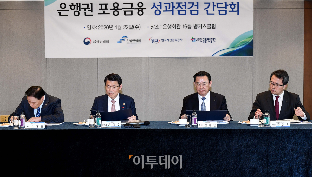 은성수(왼쪽 두번째부터) 금융위원장, 김태영 은행연합회장이 22일 서울 중구 명동 은행회관에서 열린 ‘은행권 포용금융 성과점검 간담회’에서 협약서를 살펴보고 있다.