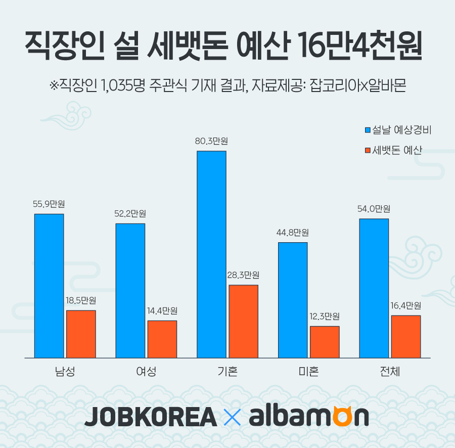 이 중 세뱃돈 예산은 16만4000원이었다. 세뱃돈 예산 역시 혼인 여부에 따른 차이가 커 미혼 직장인은 12만3000원으로 집계된 반면 기혼 직장인은 28만3000원으로 16만 원이 높았다.