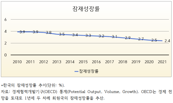 한국의 잠재성장률은 1997년만 해도 7.1%에 달했으나, 1998년 국제통화기금(IMF) 외환위기를 겪으며 5.6%로 떨어지고, 2009년에는 글로벌 금융위기 여파로 3.8%로 낮아졌다. 2018년에는 2.9%로 내리며 2%대로 떨어졌다. 내년 잠재성장률은 올해보다 낮은 2.4%로 전망된다.
