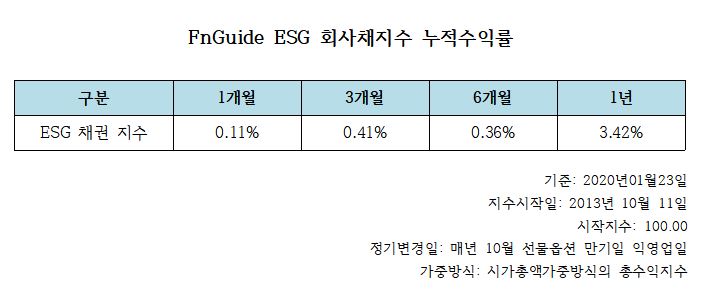 에프앤가이드 관계자는 “국내에서도 지속가능경영에 대한 관심이 늘어나고, 비재무적 지표를 이용한 투자는 세계적인 추세로 장기간 지속될 것으로 판단하여 ESG 채권지수를 만들게 되었다”고 설명했다.