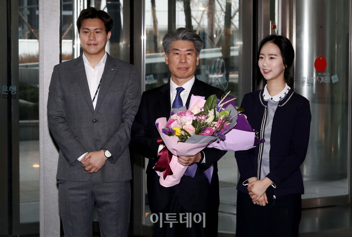 윤종원 IBK기업은행장이 29일 서울 중구 기업은행 본점에서 열린 취임식에 앞서 출근하며 직원들에게 꽃다발을 받고 있다.