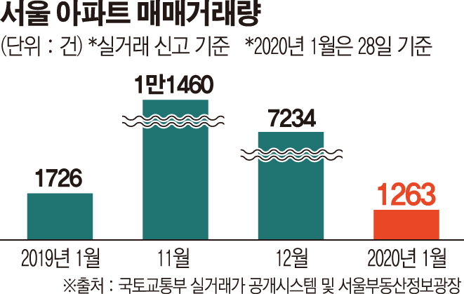 30일 서울부동산정보광장과 국토교통부 실거래가 공개시스템에 따르면 이달 들어 28일까지 총 1263건의 아파트가 매매 거래됐다. 신고된 거래를 기준으로 지난해 11월(1만1460건)과 12월(7234건) 거래 건수보다 무려 각각 89%, 83% 급감했다. 특히 2018년 9·13 부동산 대책으로 매수세가 크게 위축됐던 지난해 1월 거래량(1726건)보다도 더 적은 수치다.