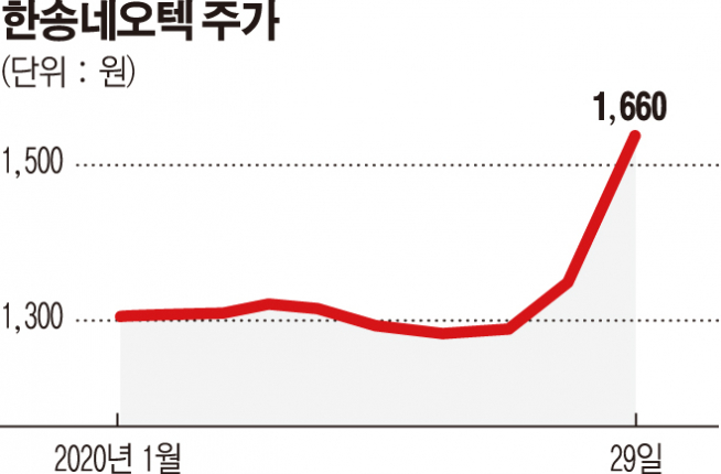 개장 초 약세로 출발한 한송네오텍은 해당 내용이 전해진 오후에 급등해 결국 전일보다 18.15% 오른 1660원에 장을 마감했다.