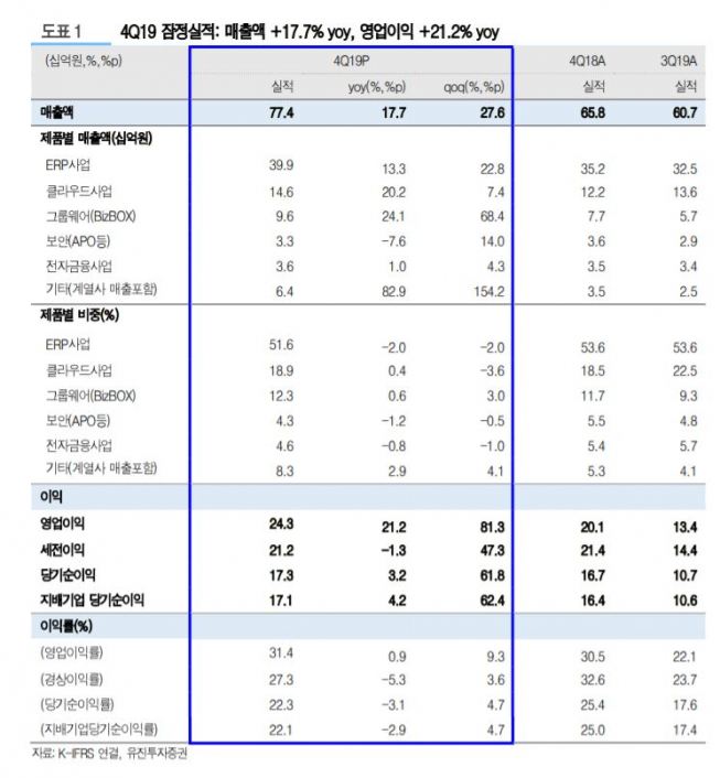 아울러 “확장형 ERP사업매출이 40%가량 증가한 점은 긍정적”이라며 “클라우드 고객도 지속적으로 증가하면서 안정적인 실적 성장을 지속할 것”으로 예상했다.