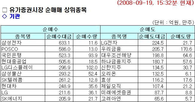 종목별로 기관은 유가증권시장에서 삼성전자 633억원, POSCO 586억원, 국민은행 523억원, 현대중공업 505억원 순으로 순매수세를 보였으며 LG전자 224억원, 우리금융 205억원, 대우조선해양 198억원, 하나금융지주 180억원 순으로 순매도세를 나타냈다.