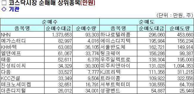 코스닥시장에서는 NHN 137억원, 메가스터디 8억원, KH바텍 6억원, 엘앤에프 6억원 순으로 순매수했고 하나로텔레콤 29억원, 에이스디지텍 19억원, 서울반도체 16억원, 팅크웨어 15억원 순으로 순매도세를 보였다.