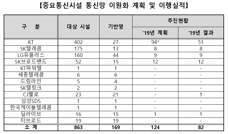 지난해 2월 수립한 통신재난관리계획에서 51개 시설에 대하여 통신망 이원화를 추진하기로 했던 것을 7월에는 2020년 통신재난관리계획에서 94개 시설로 확대했다. 하지만 통신망 설계와 운용체계 변경, 선로 보강 등에 예상보다 많은 시간이 소요돼 당초대로 51개 시설에 대해서만 이원화를 완료했다. 과기정통부는 통신망 이원화를 이행하지 못한 KT의 43개 시설에 대해 시정명령을 발령할 계획이다.