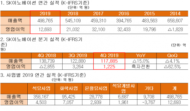 사업부별로 살펴보면 석유사업은 2018년 하반기부터 계속되어 온 정제마진 악화 영향으로 매출액 35조8167억 원, 영업이익 4503억 원을 기록했다.