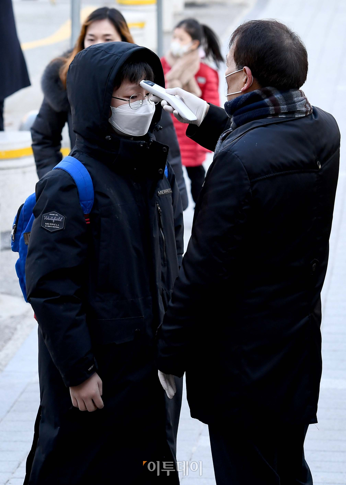 3일 서울 강남구 봉은초에서 한 학생이 체열측정을 하고 있다. 봉은초는 신종 코로나바이러스 확산 방지를 위해 지난달 31일로 예정됐던 개학을 이날로 미뤘다.