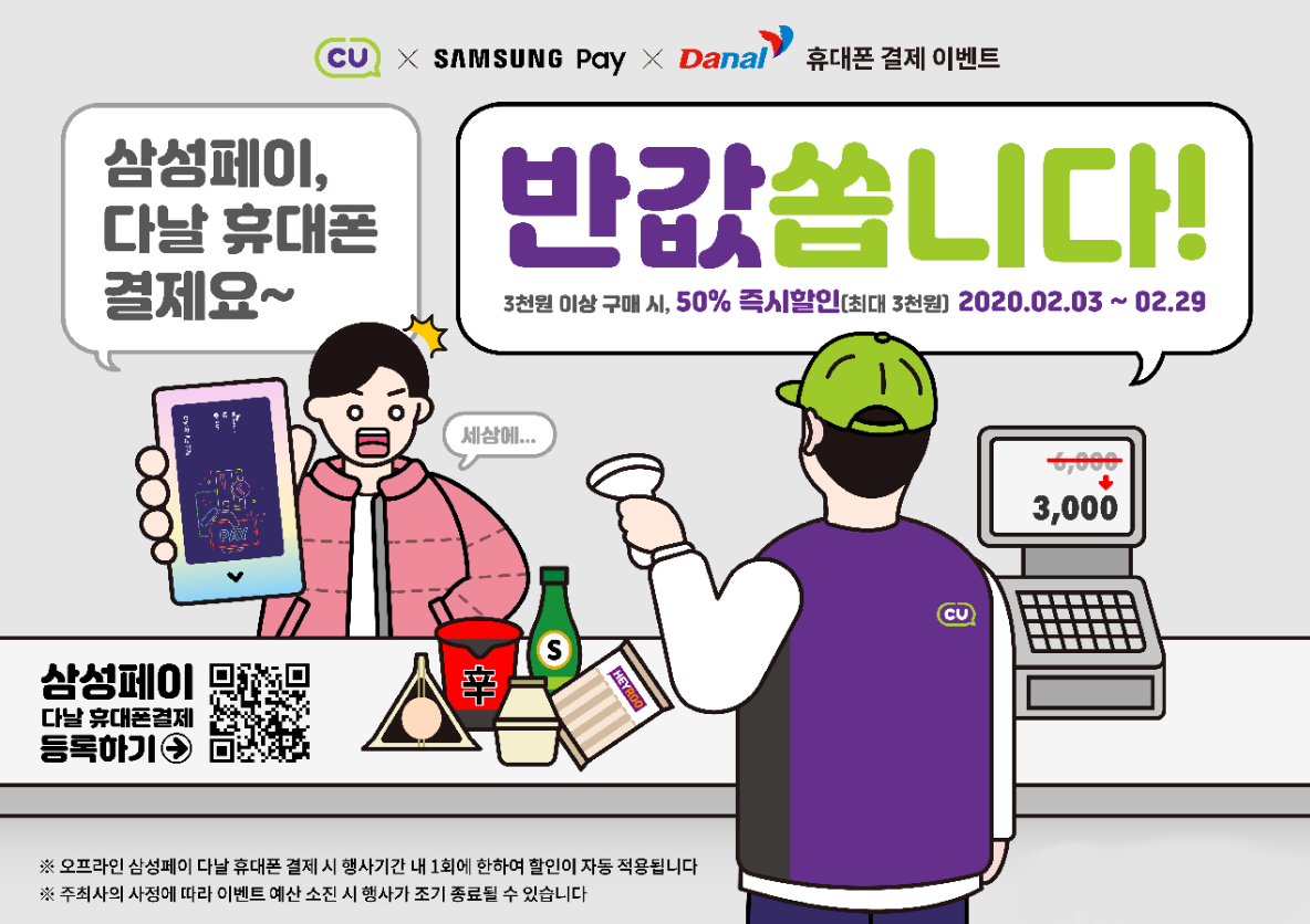 다날은 3일부터 오는 29일까지 전국 편의점 CU에서 삼성페이 다날 휴대폰 결제로 3000원 이상 결제 시 최대 50% 즉시할인 해주는 ‘CU에서 만나면 반값쏩니다!’를 진행한다고 3일 밝혔다.