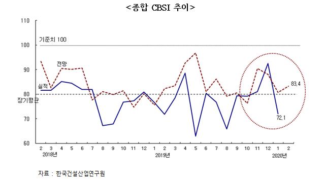 2일 한국건설산업연구원이 발표한 '1월 건설기업 경기실사지수(CBSI)'는 72.1이다. 동월 기준으로 2014년 이후 가장 낮다. 전달(92.6)보다도 20.5포인트(P) 급락했다.