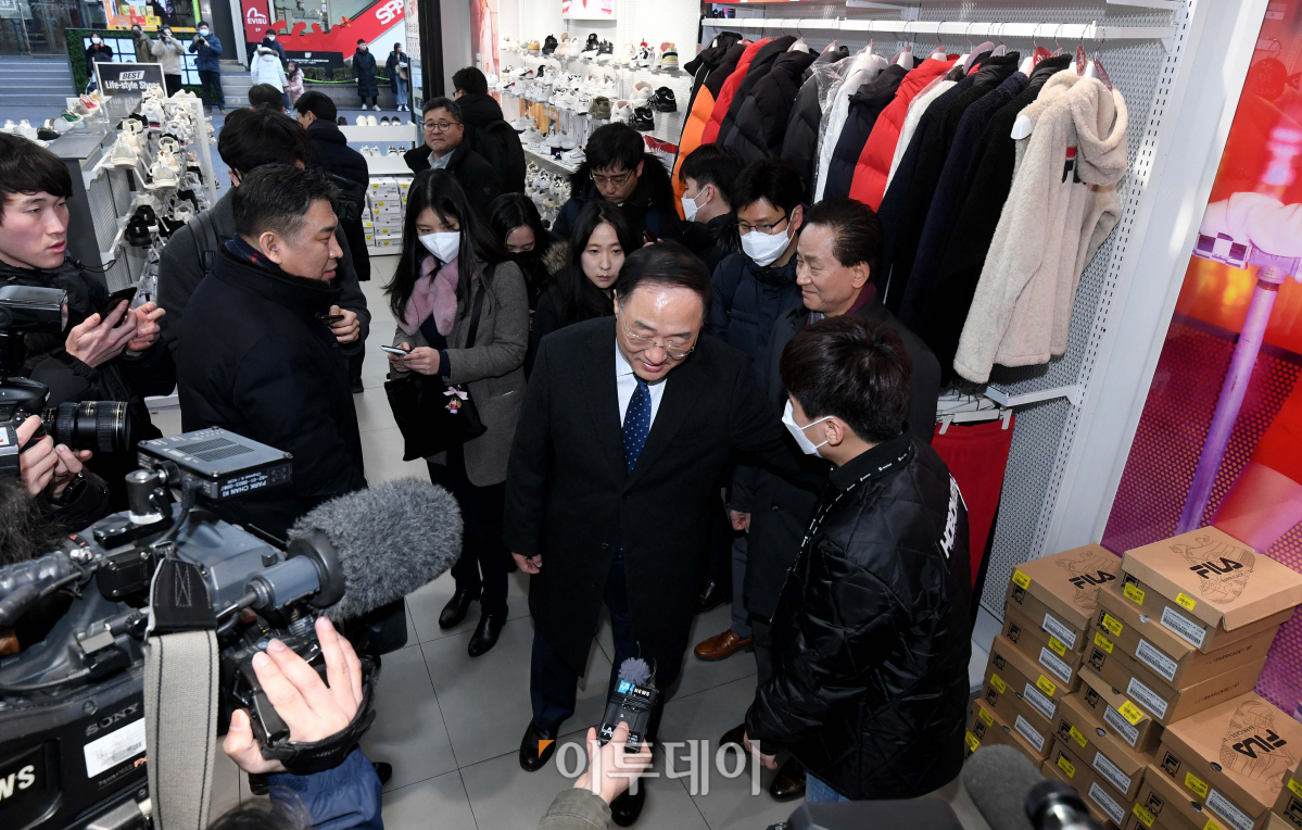 홍남기 부총리 겸 기획재정부 장관이 신종 코로나바이러스 현장 실태 점검을 위해 3일 서울 명동의 한 신발 판매점을 찾아 관계자를 격려하고 있다.