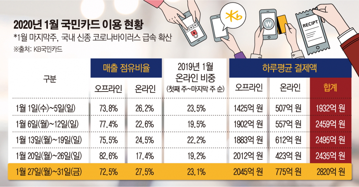 4일 KB국민카드가 집계한 ‘2020년 1월 카드 사용량’ 통계에 따르면, 신종 코로나 확진자가 잇따라 발생한 1월 마지막 주 온라인 카드 사용 비중은 27.5%로 1월 내 최고치를 기록했다. 이는 지난해 1월 온라인·오프라인 카드 사용 비중과 비교했을 때도 최고 수준이다. 이달 첫째 주 온라인 사용 비중은 26.2%였으며 둘째 주 22.6%, 셋째 주 24.5%, 설 연휴가 포함된 넷째 주는 17.4%로 조사됐다. 지난해 같은 기간과 비교해도 지난달 마지막 주 온라인 결제 비중이 더 컸다. 지난해 1월 마지막 주 온라인 사용 비중은 23.1%로 이달 마지막 주보다 4.4%포인트(P) 낮았다.