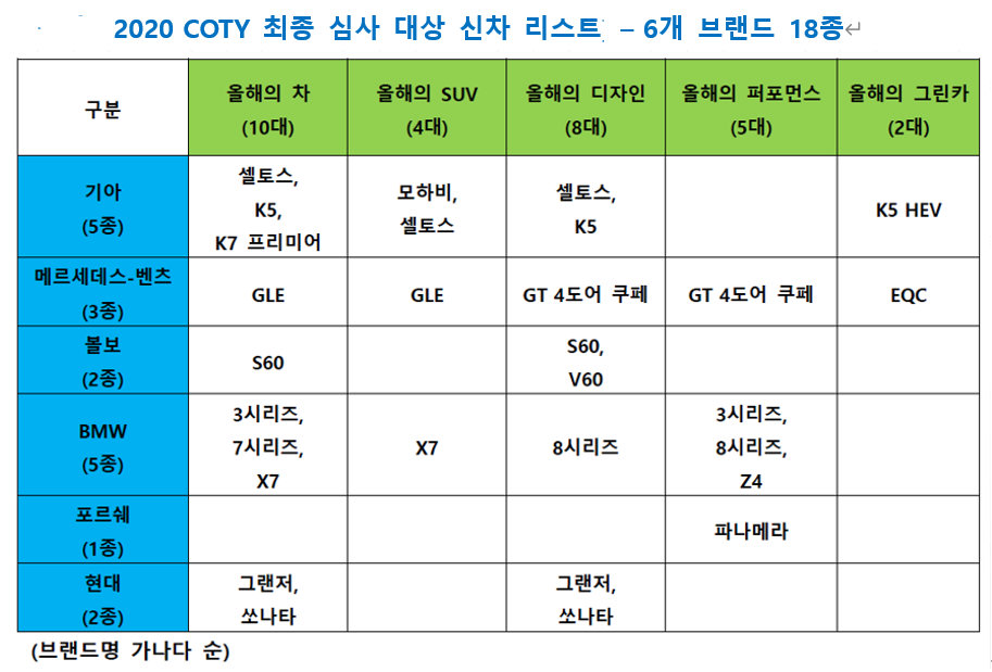 5일 협회에 따르면 최종 심사는 전반기 및 후반기 평가에서 상위를 차지한 기아차, 메르세데스-벤츠, 볼보, BMW, 포르쉐, 현대차 등 6개 브랜드 18종의 신차가 대상이다.