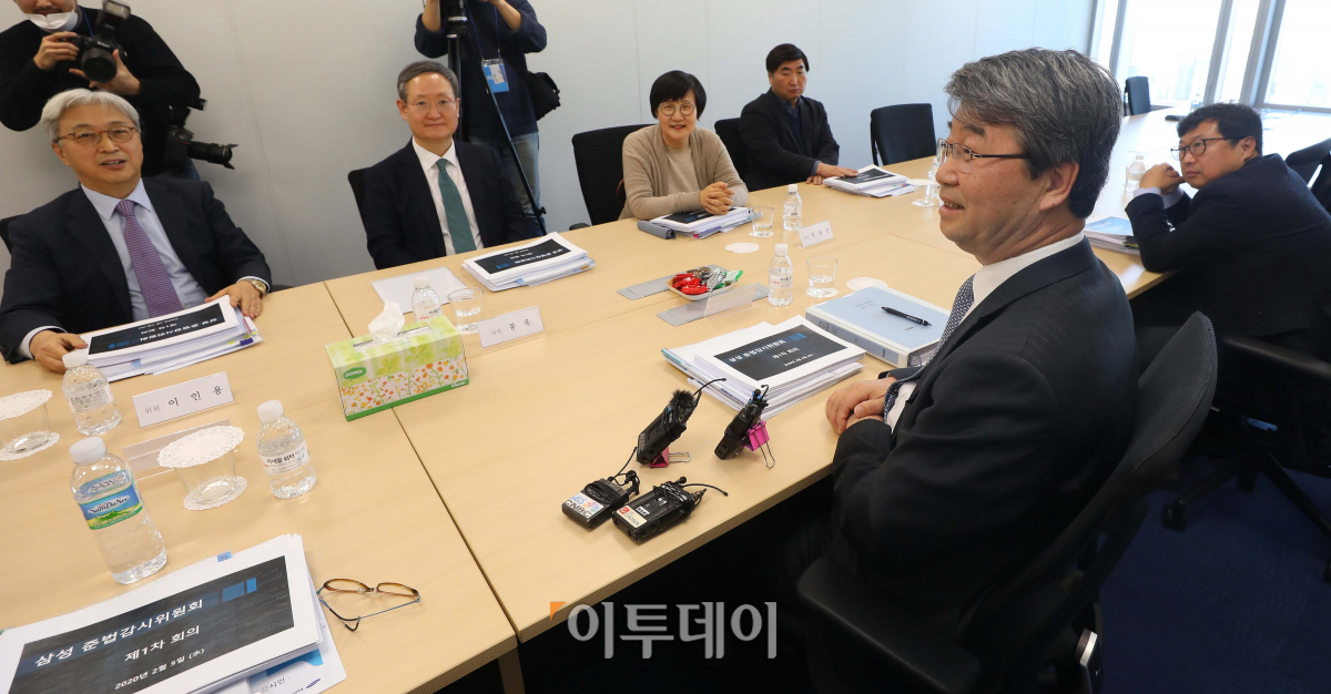 김지형(오른쪽 두번째) 삼성 준법감시위원장을 비롯한 위원들이 5일 오후 서울 서초구 삼성생명 서초타워 사무실에서 열린 '삼성 준법감시위원회 제1차 회의'에 참석해 있다.