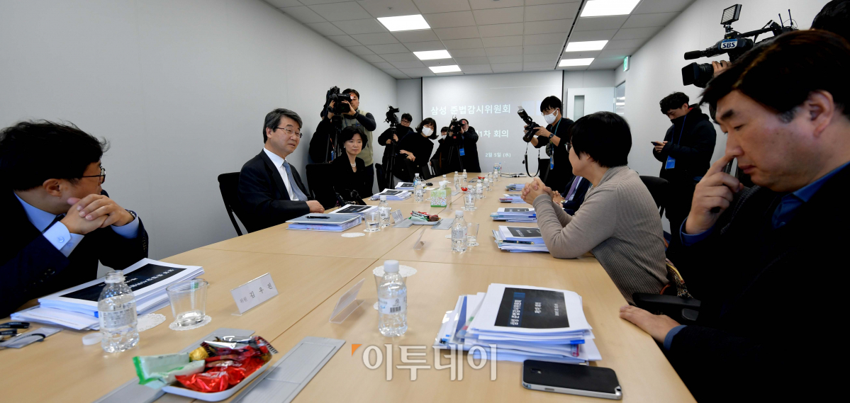 삼성의 준법 경영을 감시하는 외부 독립기구 '삼성 준법감시위원회' 첫 회의가 5일 오후 서울 서초구 삼성생명 서초타워에서 열린 가운데 김지형 위원장(왼쪽 두번째)이 모두발언을 하고 있다.