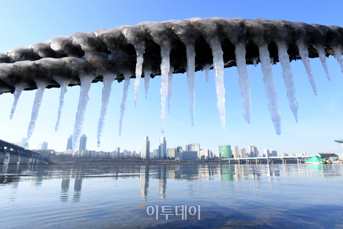서울 아침 최저기온이 영하 12도를 기록하는 등 올겨울 들어 가장 추운 날씨를 보인 6일 서울 광진구 뚝섬한강공원에 고드름이 얼어 있다.