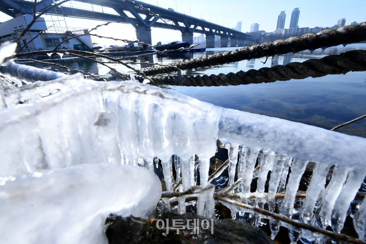 서울 아침 최저기온이 영하 12도를 기록하는 등 올겨울 들어 가장 추운 날씨를 보인 6일 서울 광진구 뚝섬한강공원에 고드름이 얼어 있다.