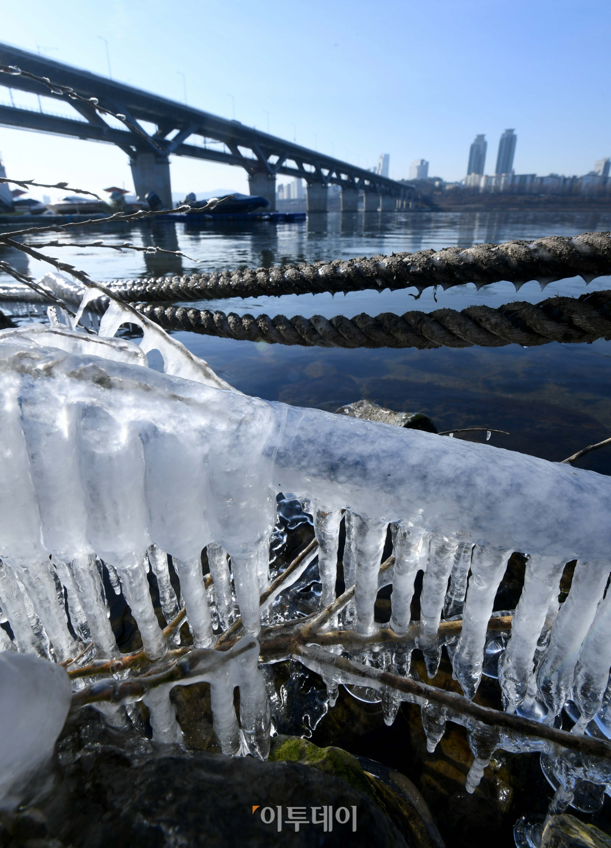 서울 아침 최저기온이 영하 12도를 기록하는 등 올겨울 들어 가장 추운 날씨를 보인 6일 서울 광진구 뚝섬한강공원에 고드름이 얼어 있다.