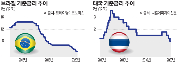 브라질 중앙은행도 올해 첫 회의에서 기준금리를 4.5%에서 4.25%로 0.25%포인트 낮췄다. 지난 1996년 기준금리가 도입된 이래 최저치다. 브라질 경제는 2015년과 2016년 마이너스(-) 성장률을 기록하며 침체에 빠졌으나 이후 네 차례 연속 금리 인하에 힘입어 성장세를 회복했다. 그러나 남미 대륙의 유일한 희망으로 떠올랐던 브라질도 신종 코로나 사태를 비켜 가지 못했다. 경제 성장 전망치 하향이 불가피하다는 판단 아래 다섯 차례 연속 금리 인하에 나섰다.