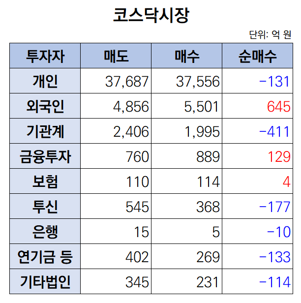 이날 외국인은 홀로 645억 원어치를 사들였다. 반면 기관과 개인은 각각 411억 원, 131억 원어치를 순매도했다.