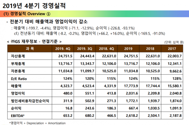 GS 관계자는 “작년 4분기 실적은 전반적으로 전년 동기 및 전 분기 대비 부진했다”며 “GS칼텍스는 전년동기 대비 흑자전환에는 성공했지만 정유 및 화학제품의 마진 스프레드 축소로 전분기 대비 실적이 감소했다”고 설명했다.