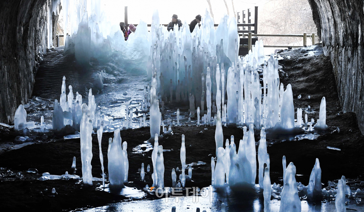 서울 아침 최저기온이 영하 12도를 기록하는 등 올겨울 들어 가장 추운 날씨를 보인 6일 경기 연천군 고대산 경원선 폐터널에 생성된 역고드름이 장관을 이루고 있다. 이 터널은 매년 겨울마다 천장에서 물방울이 땅으로 떨어지며 다양한 모양의 고드름이 종유석처럼 만들어지고 있다.