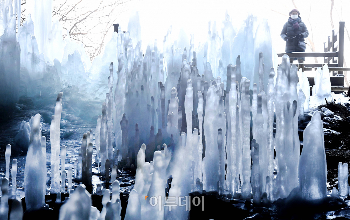 서울 아침 최저기온이 영하 12도를 기록하는 등 올겨울 들어 가장 추운 날씨를 보인 6일 경기 연천군 고대산 경원선 폐터널에 생성된 역고드름이 장관을 이루고 있다. 이 터널은 매년 겨울마다 천장에서 물방울이 땅으로 떨어지며 다양한 모양의 고드름이 종유석처럼 만들어지고 있다.