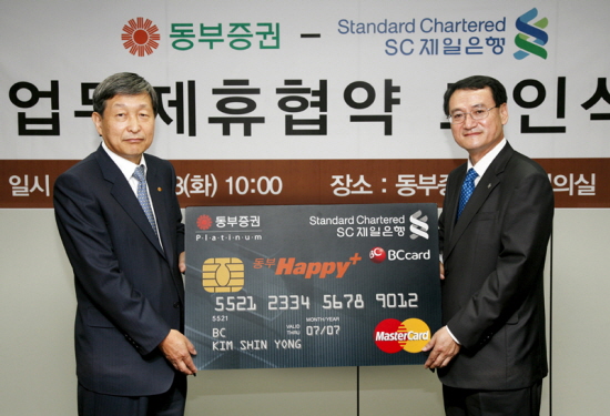 SC제일은행은 23일 동부증권과 전략적 업무제휴를 맺고 제휴카드인 '동부 Happy+카드' 발급 고객에게 주식매매수수료의 5%를 BC TOP포인트로 적립해주는 서비스를 실시한다고 밝혔다.