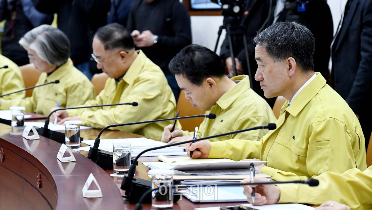 박능후 보건복지부 장관이 9일 서울 종로구 정부서울청사에서 열린 신종 코로나바이러스 감염증 대응 관련 확대 중앙사고수습본부(중수본) 회의에서 정세균 국무총리의 모두발언을 듣고 있다.