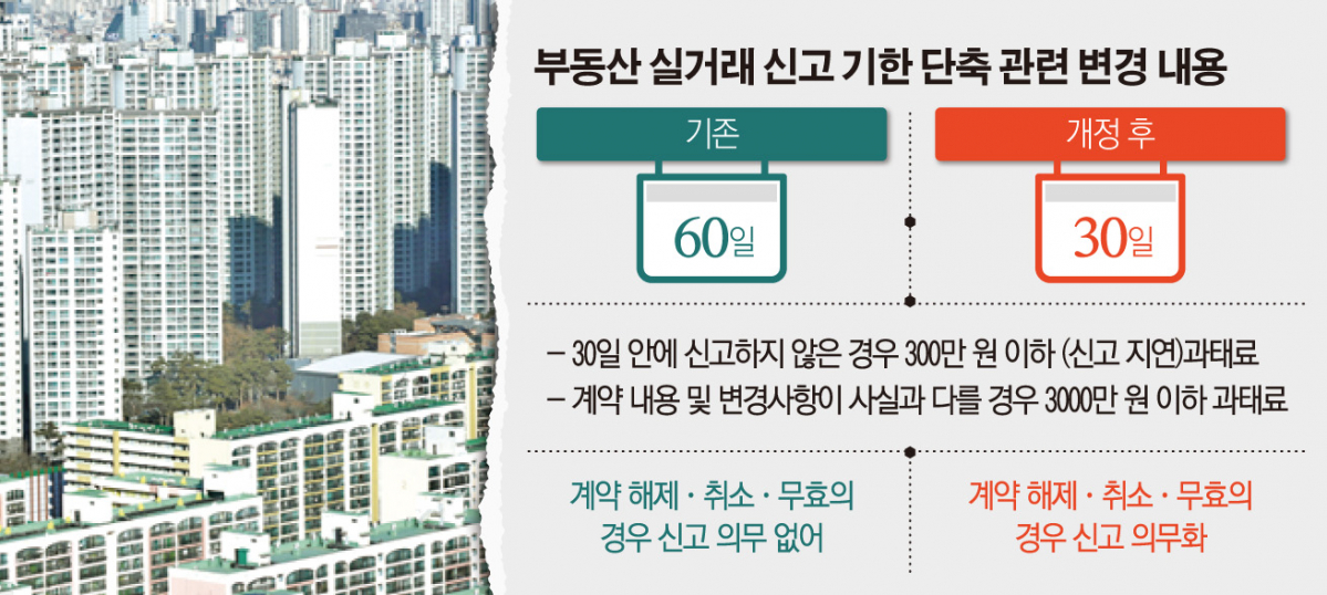 업계에 따르면 21일부터 부동산 실거래 신고 기한이 기존 60일에서 30일로 단축된다. 계약이 무효되거나 취소되는 경우에도 해제 등이 확정된 날로부터 30일 이내에 신고해야 한다. 가계약 역시 동일하게 신고해야 한다. 이를 어기면 300만 원 이하의 과태료가 부과된다.