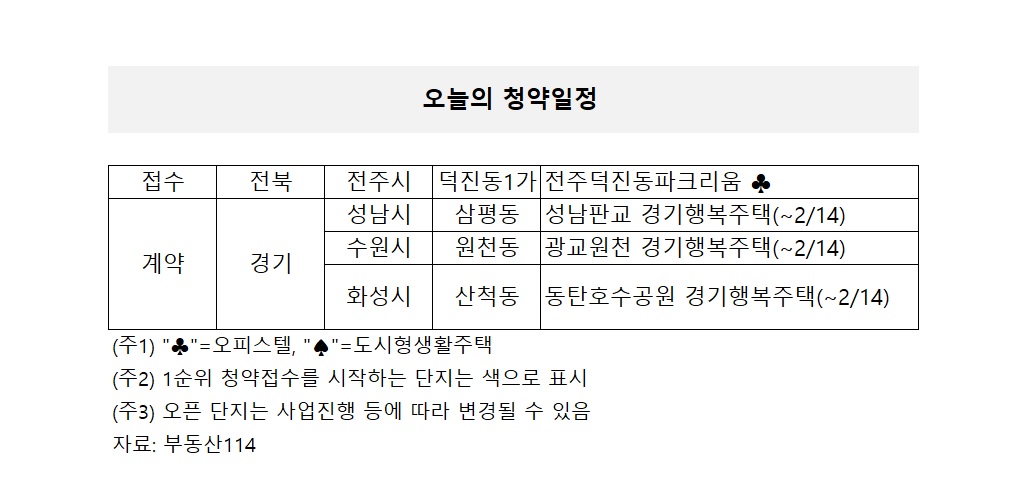부동산114에 따르면 이날 예정된 청약 접수건은 전주덕진동파크리움 뿐이다. 이외에 3건의 계약이 진행된다. 해당 사업지는 경기 성남시 ‘성남판교 경기행복주택’·수원시 ‘광교원천 경기행복주택’·화성시 ‘동탄호수공원 경기행복주택’ 등이다. 계약 기한은 이달 14일이다.
