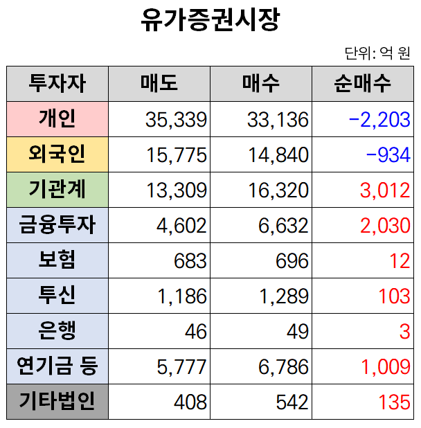 이날 개인과 외국인 투자자는 각각 2203억 원, 934억 원어치를 순매도했다. 반면 기관 투자자는 홀로 3012억 원어치를 사들였다.
