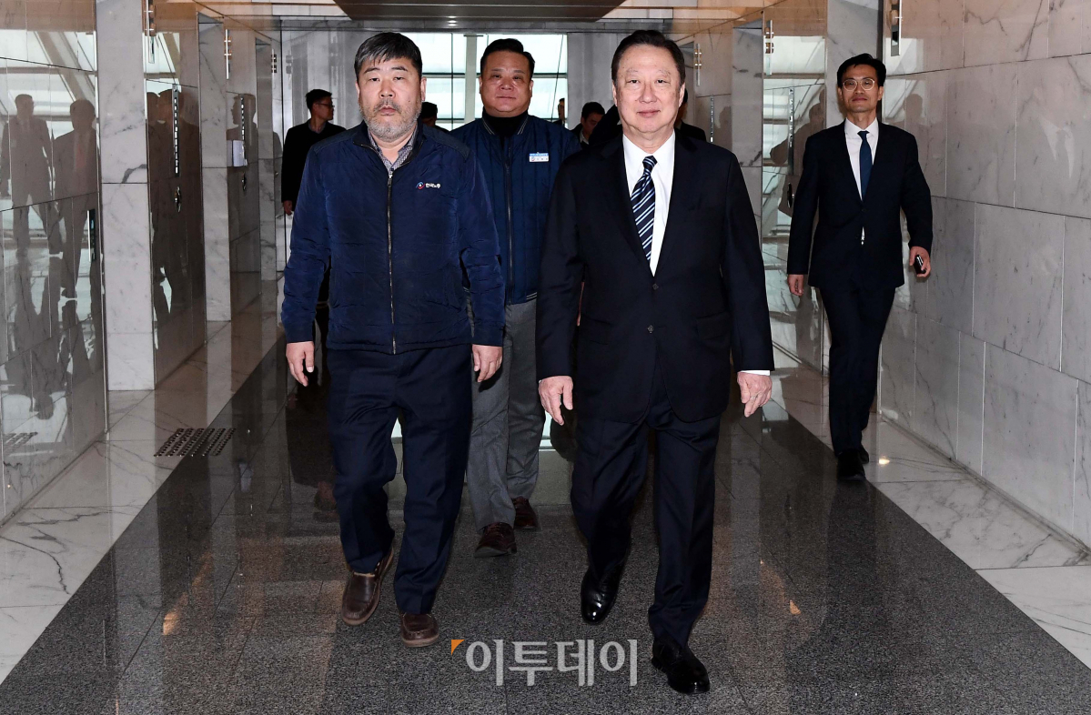 박용만 대한상공회의소 회장이 12일 서울 중구 대한상의에서 김동명 신임 한국노총위원장의 예방을 받고 접견실로 향하고 있다.