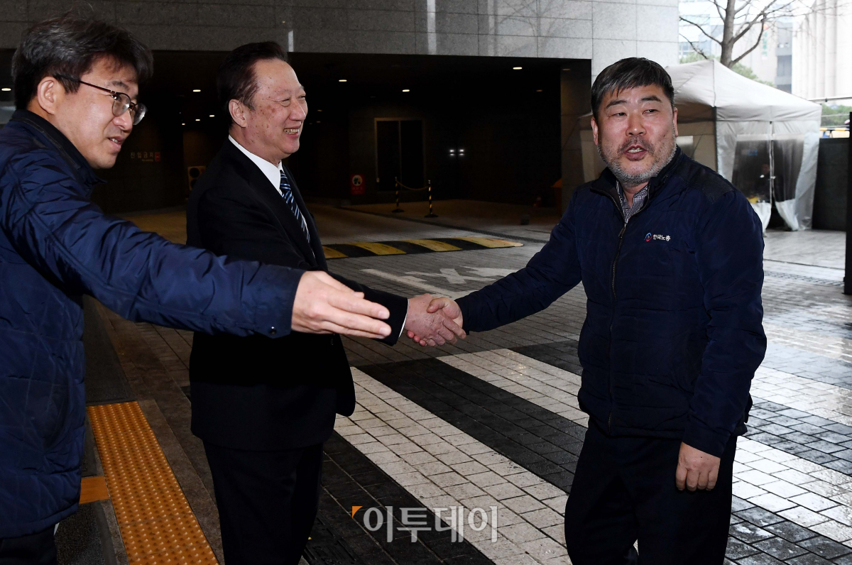[포토] 김동명 위원장 맞이하는 박용만 회장