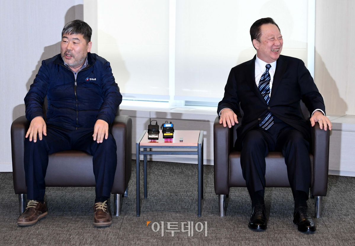 박용만 대한상공회의소 회장이 12일 서울 중구 대한상의에서 김동명 신임 한국노총위원장의 예방을 받고 환담하고 있다.