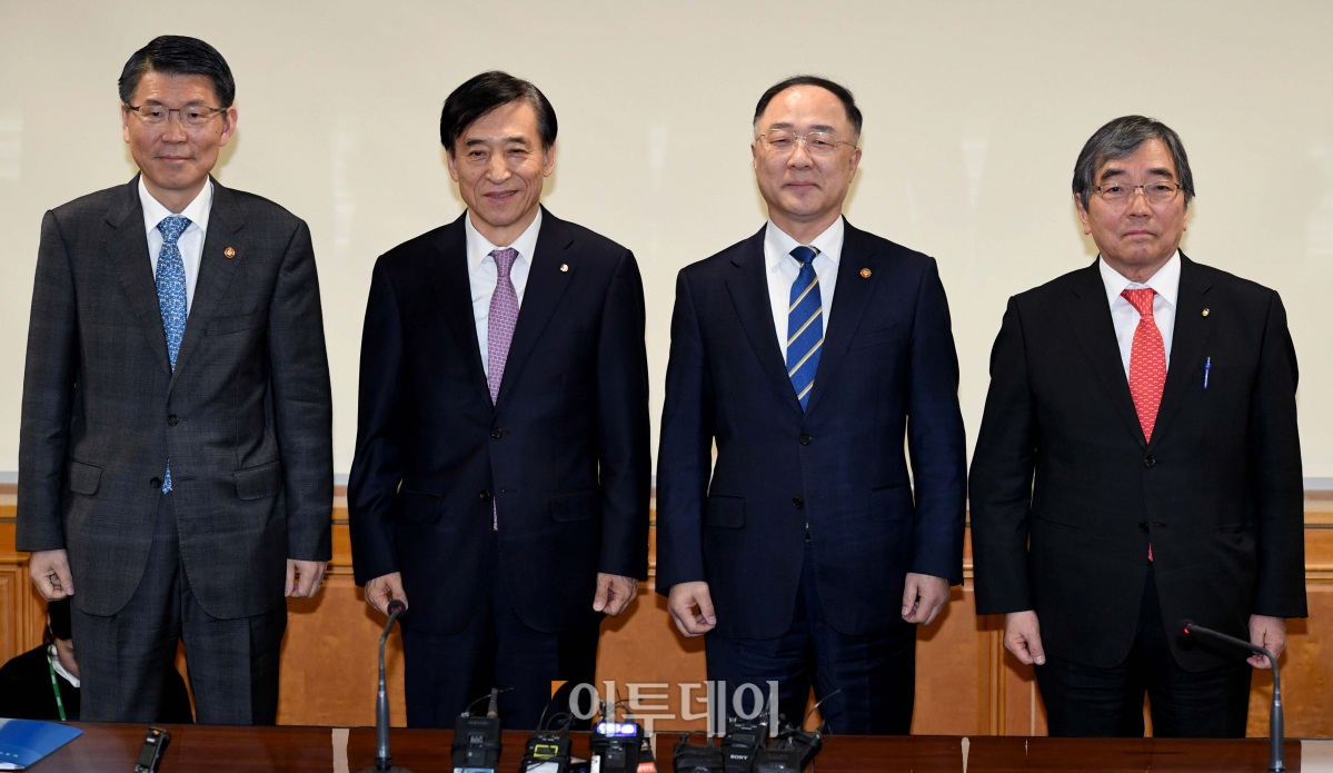 은성수(왼쪽부터) 금융위원장, 이주열 한국은행 총재, 홍남기 부총리 겸 기획재정부 장관, 윤석헌 금융감독원장이 14일 서울 중구 은행회관에서 열린 ‘거시경제금융회의’에 앞서 기념촬영을 하고 있다. 이날 회의에선 신종 코로나바이러스(코로나19)로 인한 경제적 영향 점검 및 국내외 금융시장 동향·대응방안 등이 논의됐다.