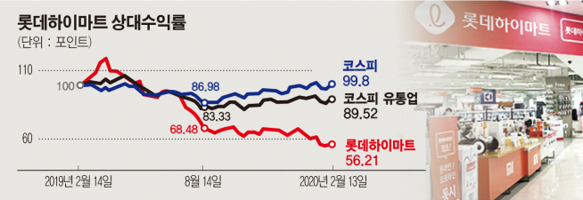 롯데하이마트의 주가 부진은 코스피지수, 코스피 유통업지수와의 상대 수익률에서도 고스란히 드러난다. 1년 전 세 지표의 값을 100으로 동일하게 변환했을 때 1년 후 코스피는 99.80, 유통업은 89.52로 낙폭이 크지 않았던 반면 롯데하이마트는 56.21로 반토막이 났다. 그만큼 주가 하락폭이 컸다는 의미다.