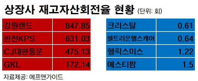 가장 높은 곳은 강원랜드로, 847.85회를 기록했다. 한전KPS와 CJ대한통운은 각각 631.03회, 475.13회를 기록했다. 그 다음 순위가 100회 수준으로 떨어지는 것을 감안하면 이들 세 회사의 재고자산의 출입이 매우 잦았던 셈이다.