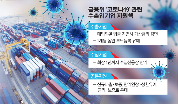 금융위는 중국 우한으로 수출하는 중소기업들의 애로사항을 해결하는 방안도 발표했다. 수출 기업에 매입외환 입금이 지연될 경우 가산금리를 감면하고, 1개월간 부도 등록을 유예하겠다는 지원책을 내놨다. 수입 기업에는 최장 1년까지 수입신용장 만기를 연장하겠다는 방안도 포함됐다.