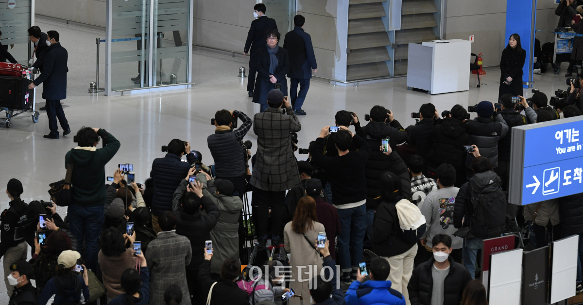 영화 ‘기생충’으로 세계 최고 권위의 영화 시상식인 미국 아카데미 시상식에서 작품상 등 4관왕을 차지한 봉준호 감독이 16일 인천 중구 인천국제공항을 통해 귀국하고 있다.