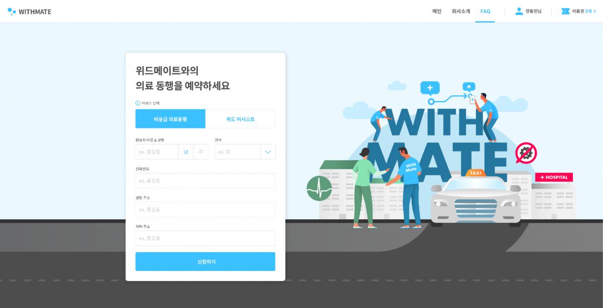 위드메이트는 미국, 캐나다, 일본 등 해외에서 활발하게 이루어지고 있는 비응급 의료 동행 서비스를 국내 환경에 맞춰 ‘웹-앱(Web-App)’ 형태로 옮겨온 매칭 플랫폼이다.
