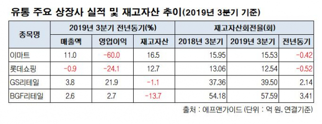 반면, 이마트와 롯데쇼핑은 재고자산회전율이 느려진 것으로 집계됐다. 3분기 기준 이마트는 15.95회에서 15.53회로 0.42회 줄었다. 롯데쇼핑은 13.06회에서 12.54회로 0.52회 감소했다.
