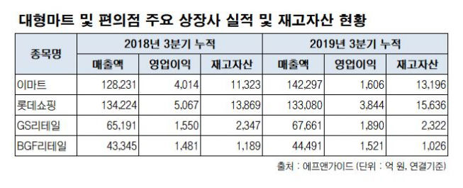 주목할 점은 두 곳 모두 매출액이 증가하고 재고자산이 감소했다는 점이다. GS리테일은 3분기 매출액(연결기준, 누적)이 2018년 6조5191억 원에서 2019년 6조7661억 원으로 3.8% 증가했다. 반면 재고자산은 2347억 원에서 2322억 원으로 1.1% 감소세를 보였다.
